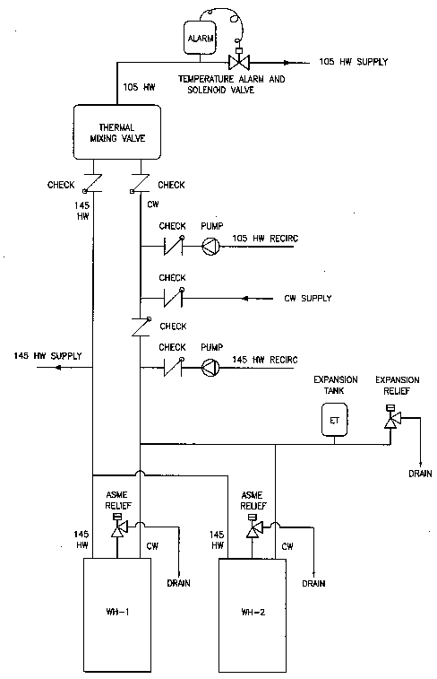 A lower hot water temperature circuit for handwashing, showers and miscellaneous use.